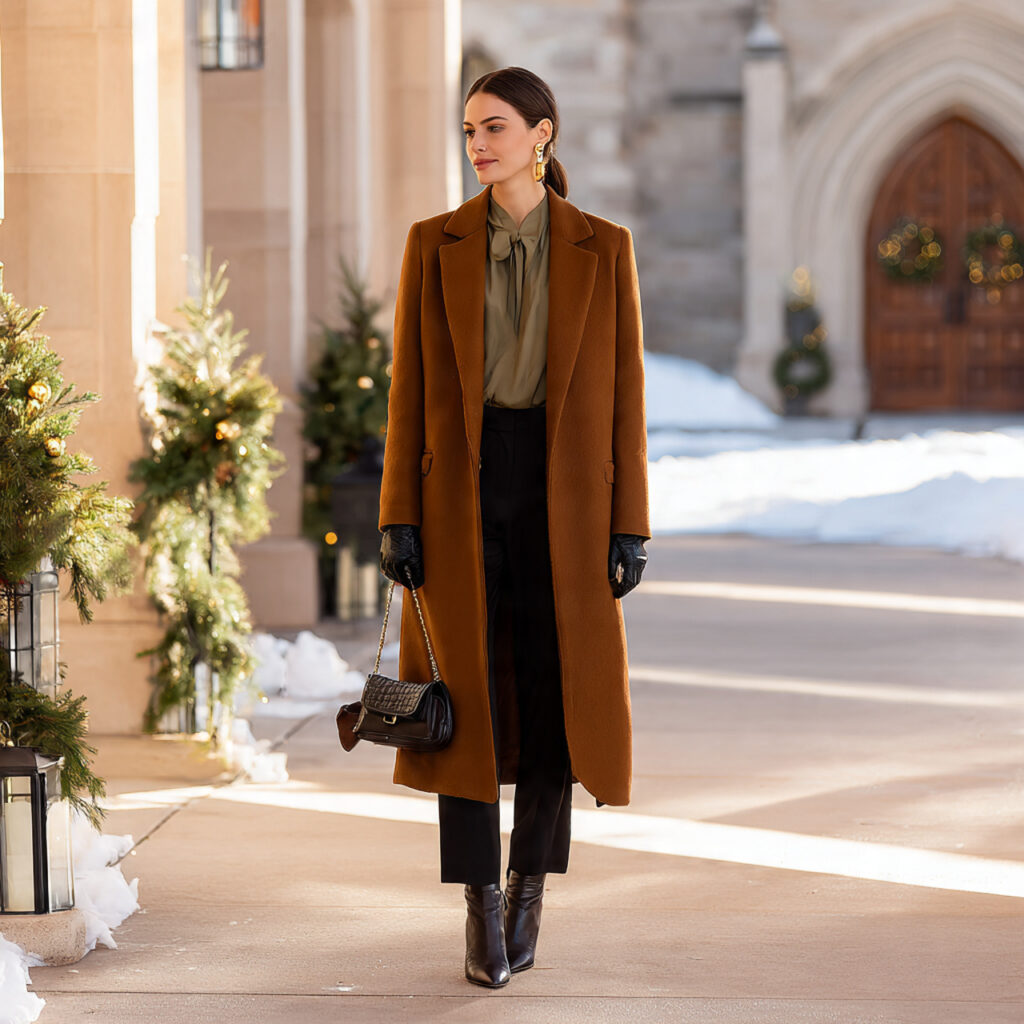 For colder Christmas church services, a tailored wool coat over a blouse and wool trousers is refined and warm without fuss. Add simple leather gloves and a crossbody bag to complete the polished outfit.