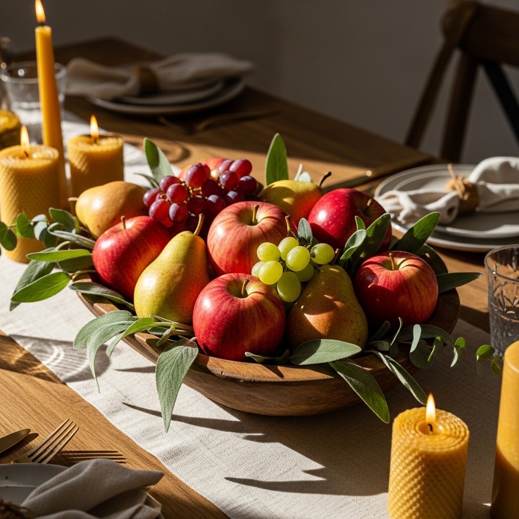 There’s something irresistibly authentic about a table that feels freshly gathered from the season’s bounty. Picture a low wooden bowl brimming with red and blush apples, golden pears, and clusters of deep grapes, nestled among sprigs of eucalyptus and soft sage leaves. The centerpiece glows with quiet abundance — not curated, but lovingly composed.