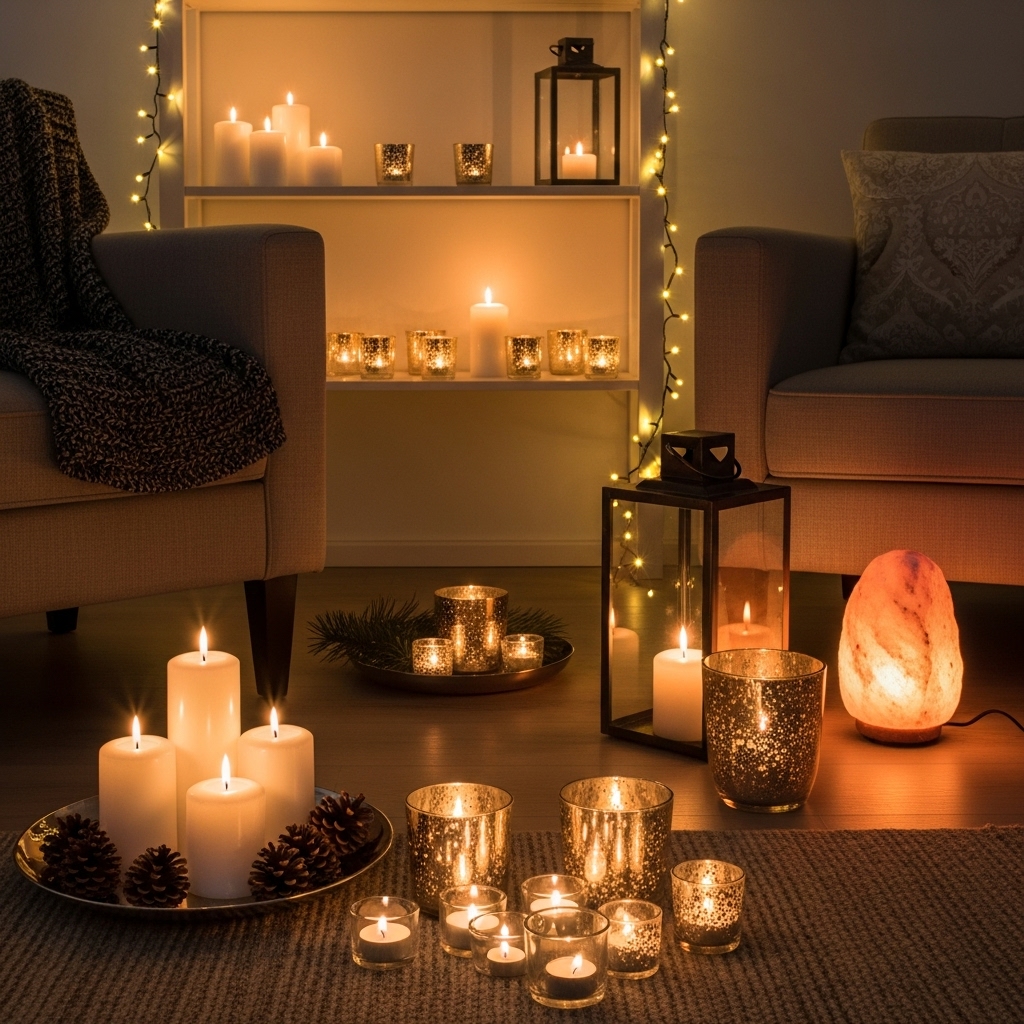 Complement candles with string lights draped along shelves or mantelpieces, lanterns placed by seating areas, or Himalayan salt lamps for subtle warmth. The ambient glow wraps your space in comfort and welcome.