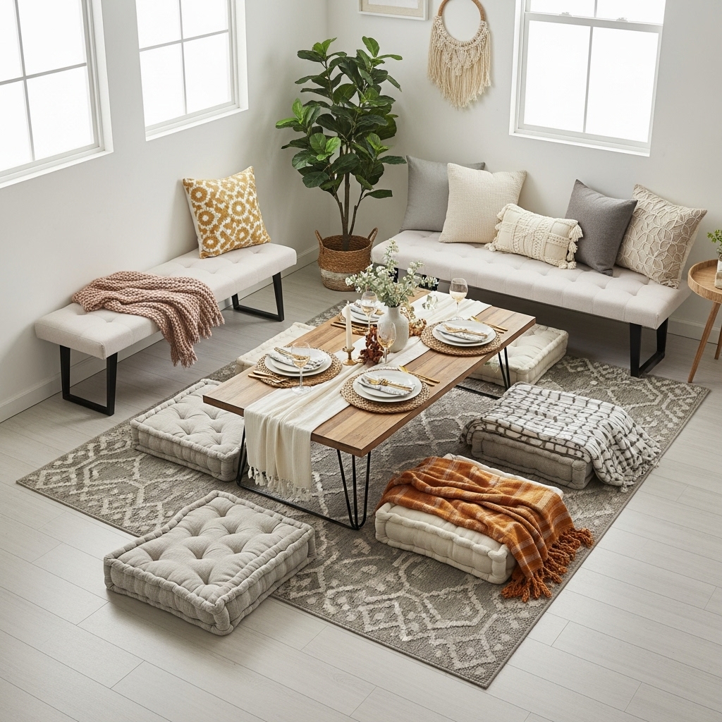 Floor seating with cushions and throws transforms mealtime into a cozy and casual experience, especially for Friendsgiving-style gatherings. Don’t stress about matching seating; mix-and-match chairs or borrow foldables to accommodate guests comfortably, adding cushions and blankets for warmth and support.