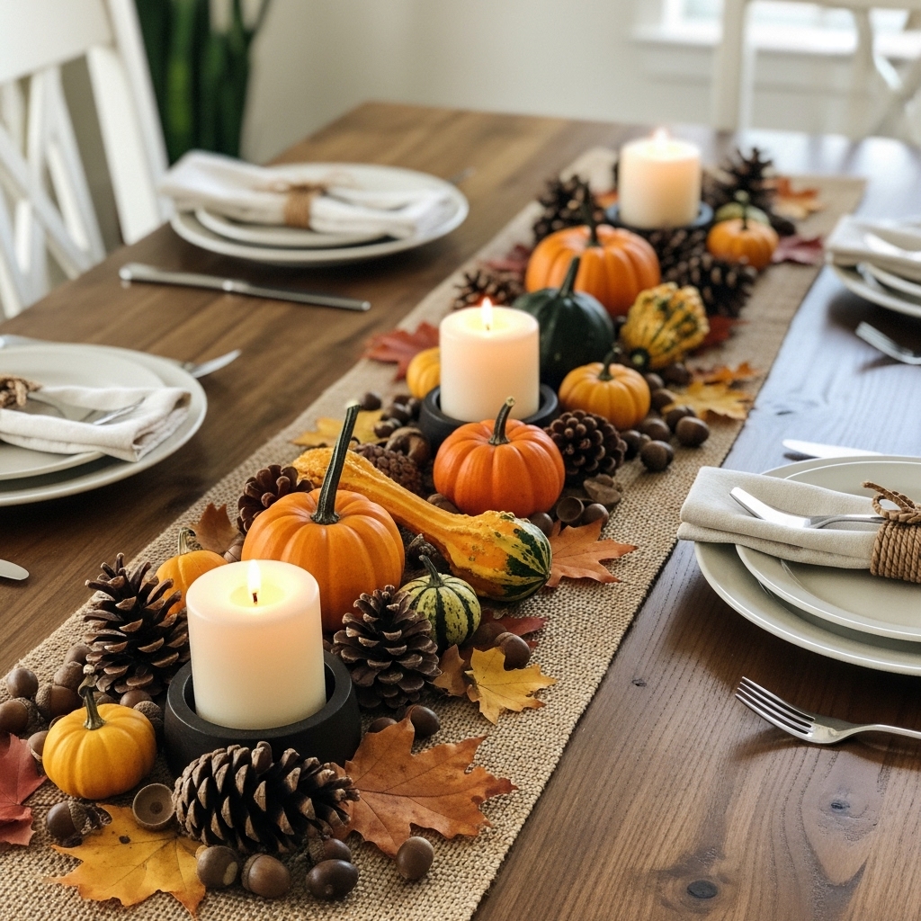 Nature offers affordable, beautiful décor options that perfectly fit the cozy Thanksgiving aesthetic. Collect pinecones, acorns, and colorful fallen leaves to make simple table runners or place around candle bases. Small pumpkins and gourds in various shapes and colors add visual interest to your table and room.