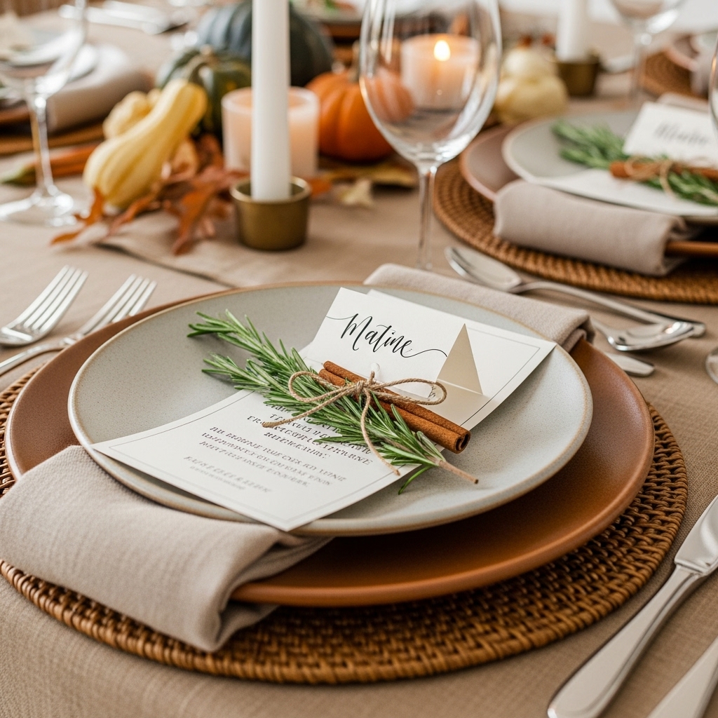 Add personal warmth by customizing your table settings. Handwritten name cards paired with small touches like a cinnamon stick or rosemary sprig tied with twine can serve as simple yet elegant decorations. You could also tuck in a gratitude note or a festive quote at each setting to inspire thoughtful moments throughout the meal.