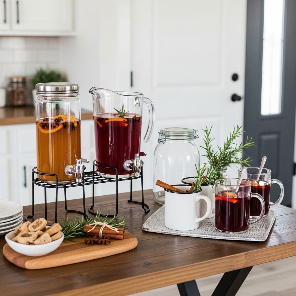 A small beverage station adds a festive flair with minimal effort. Offer warm drinks like spiced apple cider or hot mulled wine, displayed in charming glass pitchers or rustic mugs. Add garnishes such as cinnamon sticks, star anise, or fresh rosemary sprigs for an aromatic touch.