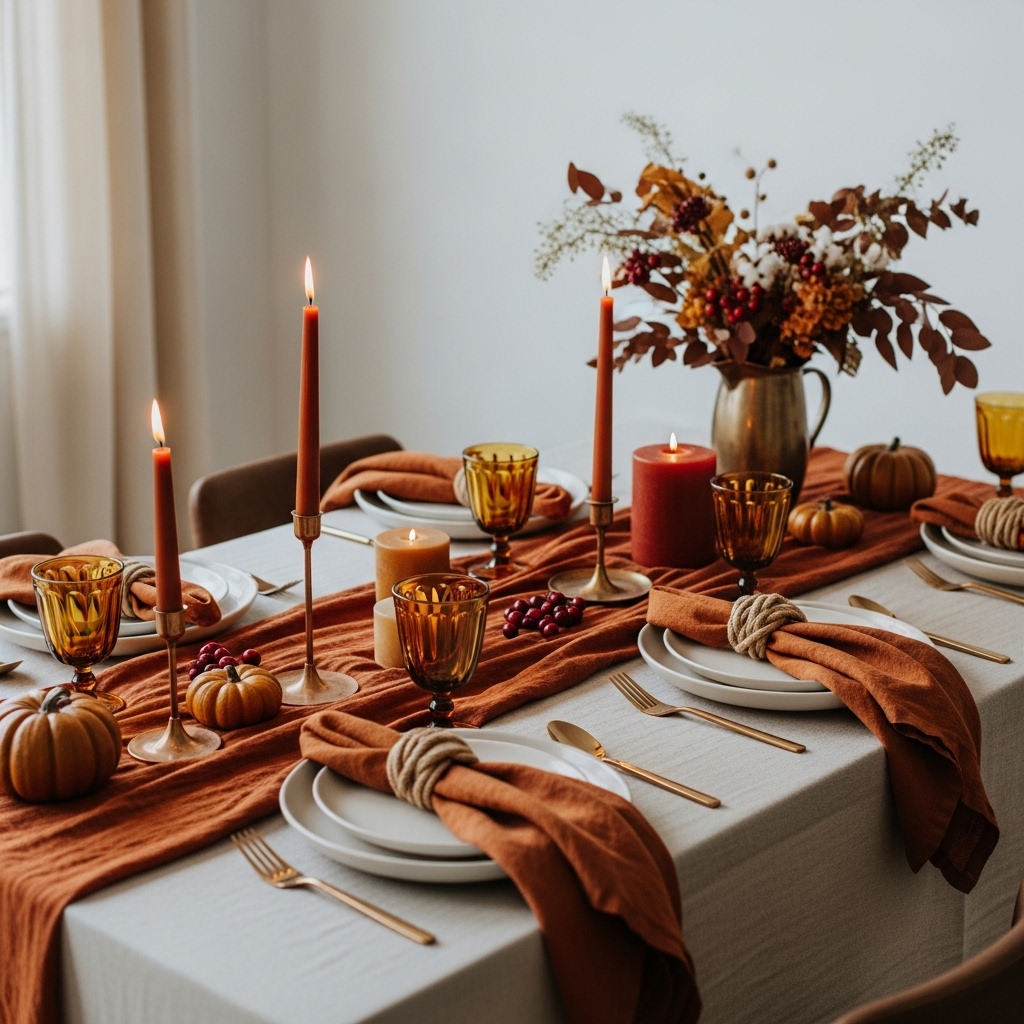Layer these colors across your tablecloths, napkins, candles, and even your dishware. For example, soft linen runners in muted rust paired with amber glassware or copper candlesticks create a tactile and visually stunning tablescape. Textile textures like wool, cotton, and velvet add depth and softness, reinforcing the cozy vibe.