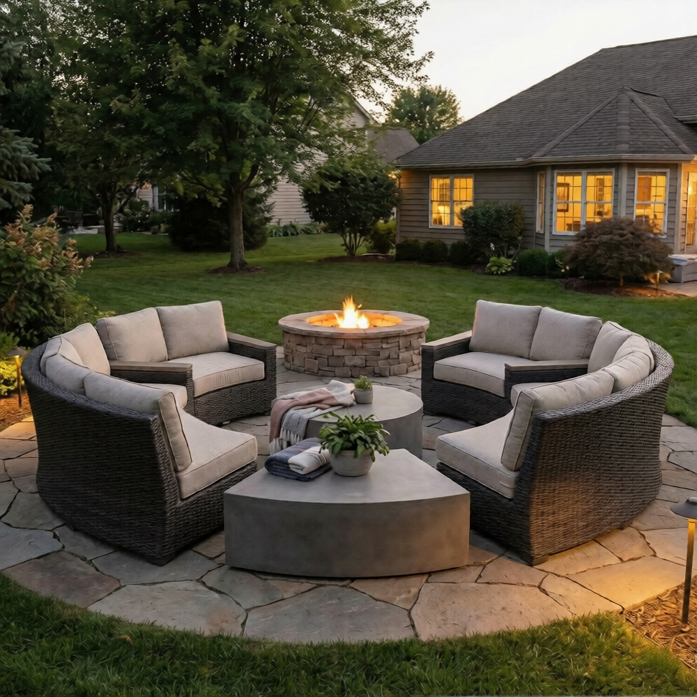 When the furniture is substantial, it anchors the room and makes the outdoors feel like a legitimate extension of the home. In a larger backyard, a curved sectional following the line of a circular patio creates a natural “hug” for guests.