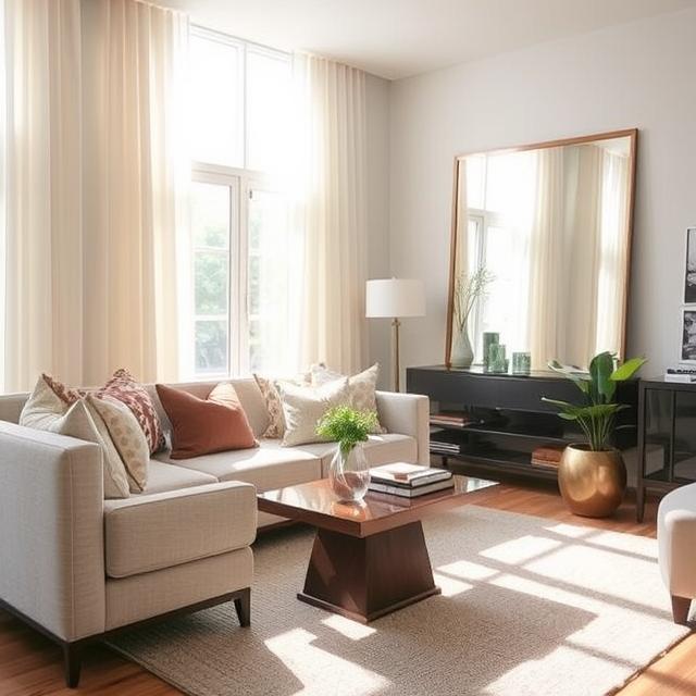 Don’t forget the beauty of natural sunlight. Use sheer curtains to let in daylight while maintaining privacy. Large mirrors placed opposite windows can double the light effect, making your living room feel bigger and brighter.