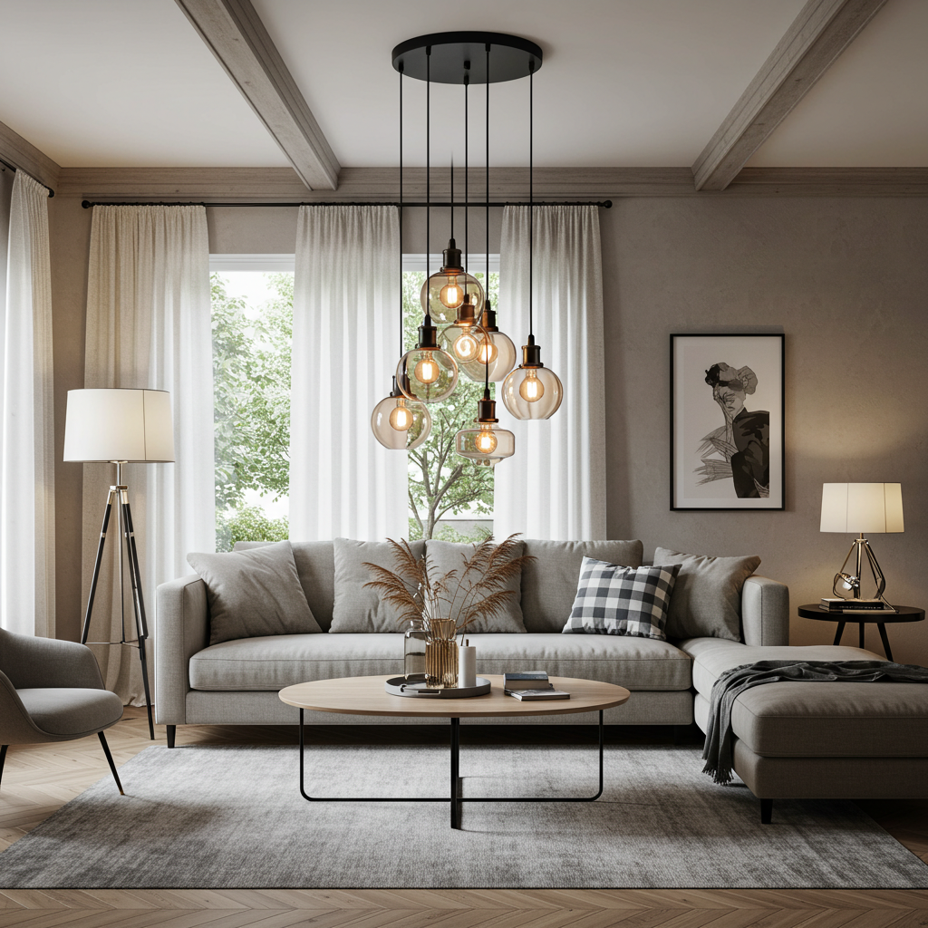 Pendant lights offer style and functionality, especially in open-plan living rooms. A cluster of pendants above a coffee table or side area adds visual interest. Choose glass pendants for a chic vibe or metal fixtures for industrial charm. They’re a great way to create focused pools of light.