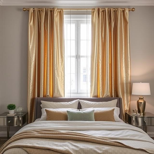 Metallic-toned curtains add a subtle touch of glamor without overwhelming the room. Silver, gold, or bronze finishes reflect light, making the space feel brighter and more dynamic. Balance them with neutral walls and clean-lined furniture so the metallics stand out tastefully.