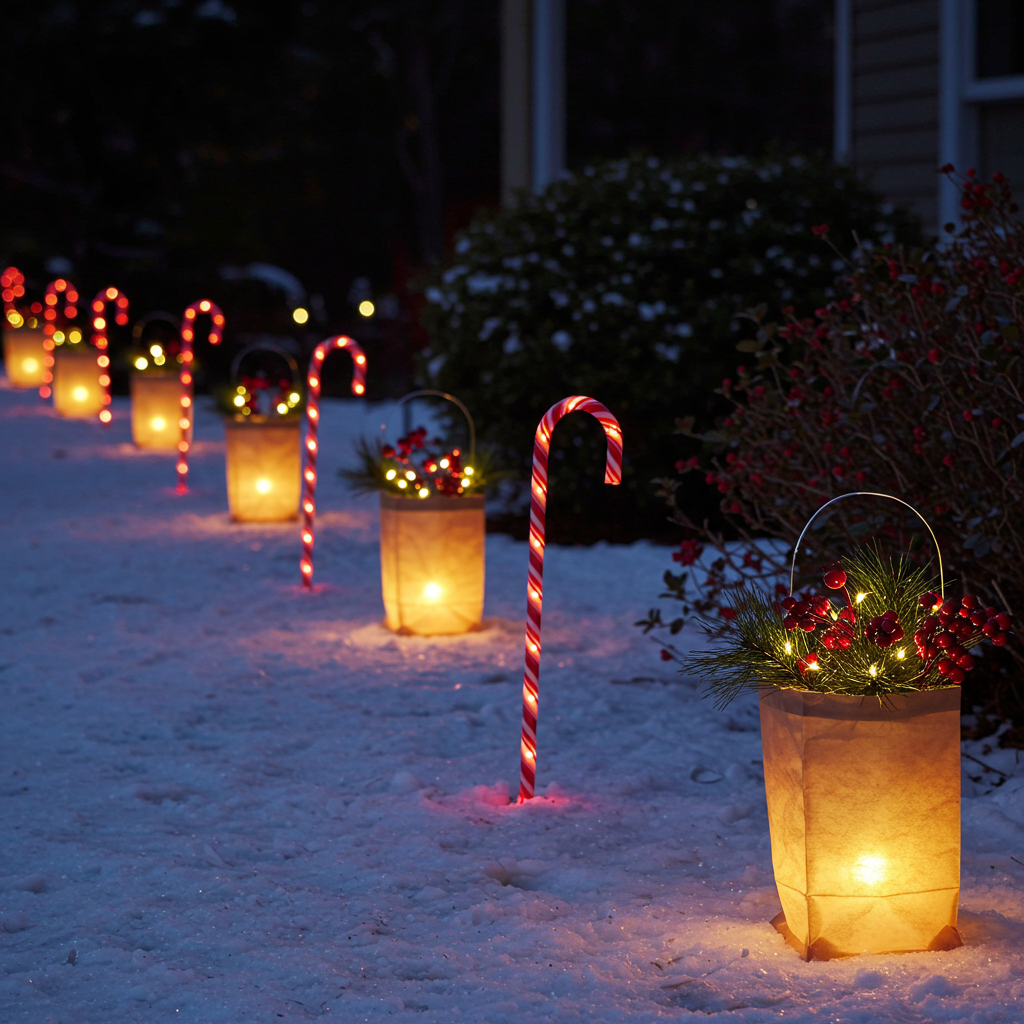 • Candy cane stakes with red-and-white lights.