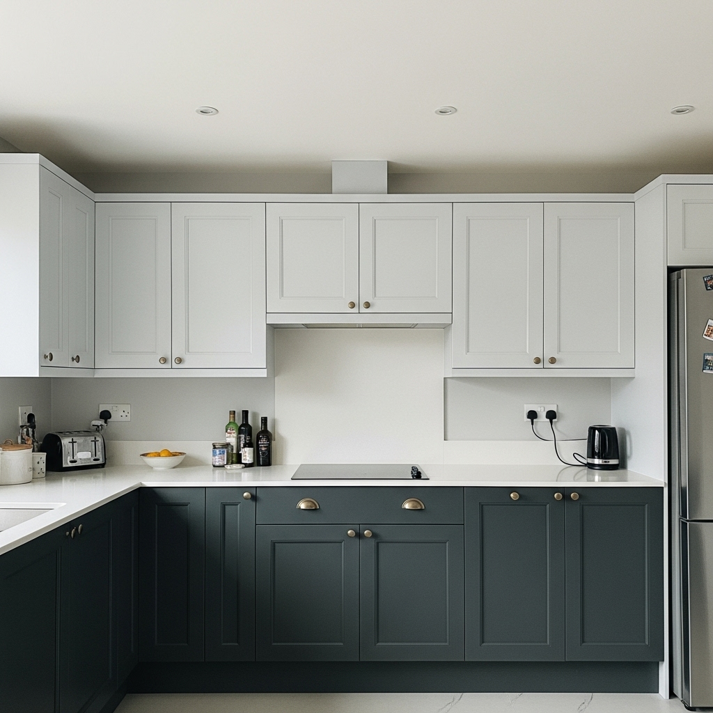 This usually involves painting the lower cabinets a darker, grounding shade; like charcoal, forest green, or navy while keeping the upper cabinets white or a light neutral. This technique anchors the kitchen visually while keeping the upper portion airy and open.