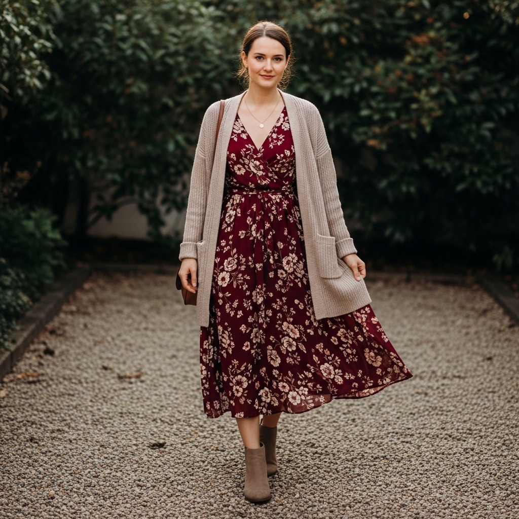 12. Floral Midi Dress with a Soft Cardigan