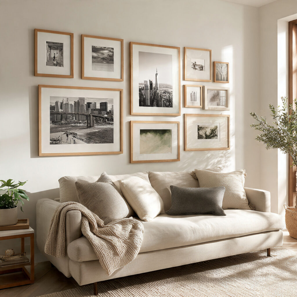 A gallery wall works because it creates a central visual story instead of scattered pieces fighting for attention. Choose frames with similar tones; black, wood, or gold to form unity even if the artwork varies.